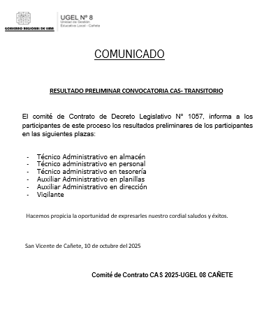 Vie, 10 de octubre del 2025, 6:13 PM por UGEL 08 CAÑETELa UGEL N.° 08 – Cañete informa a los postulantes del proceso de Convocatoria CAS Transitorio 2025 los resultados preliminares de las siguientes plazas: