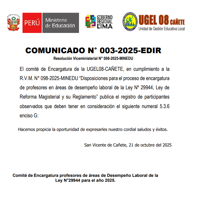 Mar, 21 de octubre del 2025, 5:46 PM por UGEL 08 CAÑETEEl comité de Encargatura de la UGEL08-CAÑETE, en cumplimiento a la R.V.M. N° 098-2025-MINEDU “Disposiciones para el proceso de encargatura de profesores en áreas de desempeño laboral de la Ley Nº 29944, Ley de Reforma Magisterial y su Reglamento” publica el registro de participantes observados que deben tener en consideración el siguiente numeral 5.3.6 enciso G: Hacemos propicia la oportunidad de expresarles nuestro cordial saludos y éxitos.