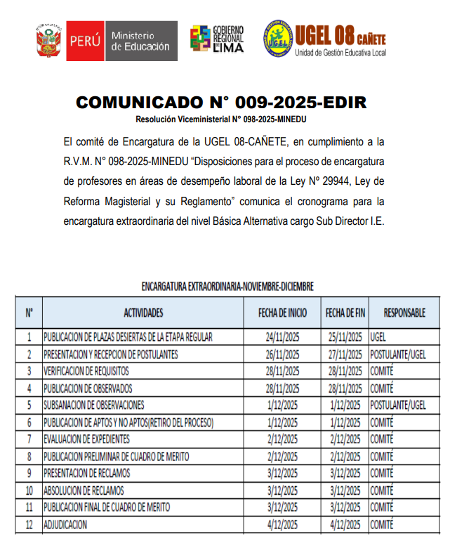 📢 COMUNICADO N.° 009-2025-EDIR – UGEL 08 CAÑETE.