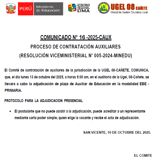 La UGEL N.° 08 – Cañete informa que este lunes 13 de octubre del 2025, a las 9:00 a.m., se realizará la adjudicación presencial de la plaza de Auxiliar de Educación – modalidad EBE Primaria, en el auditorio de la UGEL 08 – Cañete.