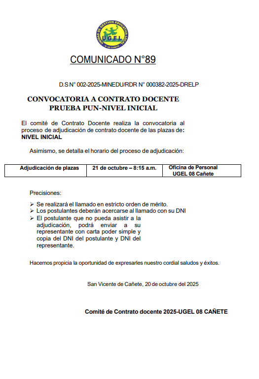 Lun, 20 de octubre del 2025, 5:41 PM por UGEL 08 CAÑETEConvocatoria a Contrato Docente – Prueba PUN Nivel Inicial