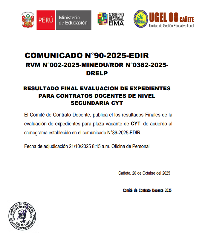 El Comité de Contrato Docente de la UGEL 08 Cañete publica los resultados finales de la evaluación de expedientes para la plaza vacante de Ciencia y Tecnología (CYT), conforme al cronograma establecido en el Comunicado N° 86-2025-EDIR.