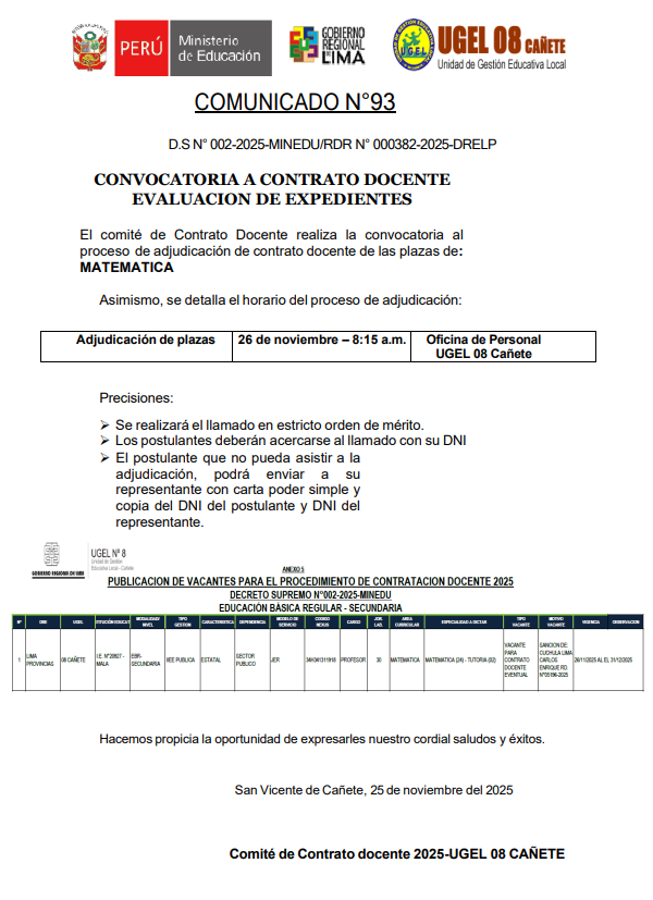 Mar, 25 de noviembre del 2025, 3:49 PM por UGEL 08 CAÑETELa UGEL 08 Cañete informa la convocatoria al proceso de adjudicación de contrato docente para las plazas de Matemática del nivel Secundaria, conforme al D.S. N.° 002-2025-MINEDU/RDR N.° 000382-2025-DRELP.