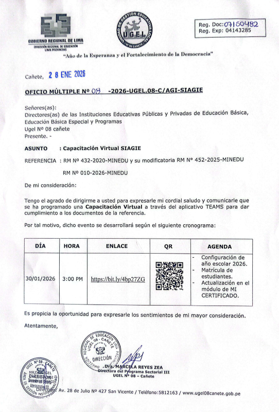 La UGEL N.° 08 Cañete convoca a los Directores(as) de las Instituciones Educativas Públicas y Privadas de Educación Básica, EBE y Programas a participar en la Capacitación Virtual SIAGIE.