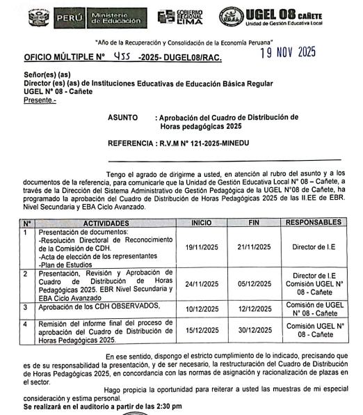 Mié, 19 de noviembre del 2025, 6:21 PM por UGEL 08 CAÑETEAsunto: Aprobación del Cuadro de Distribución de Horas Pedagógicas 2025
