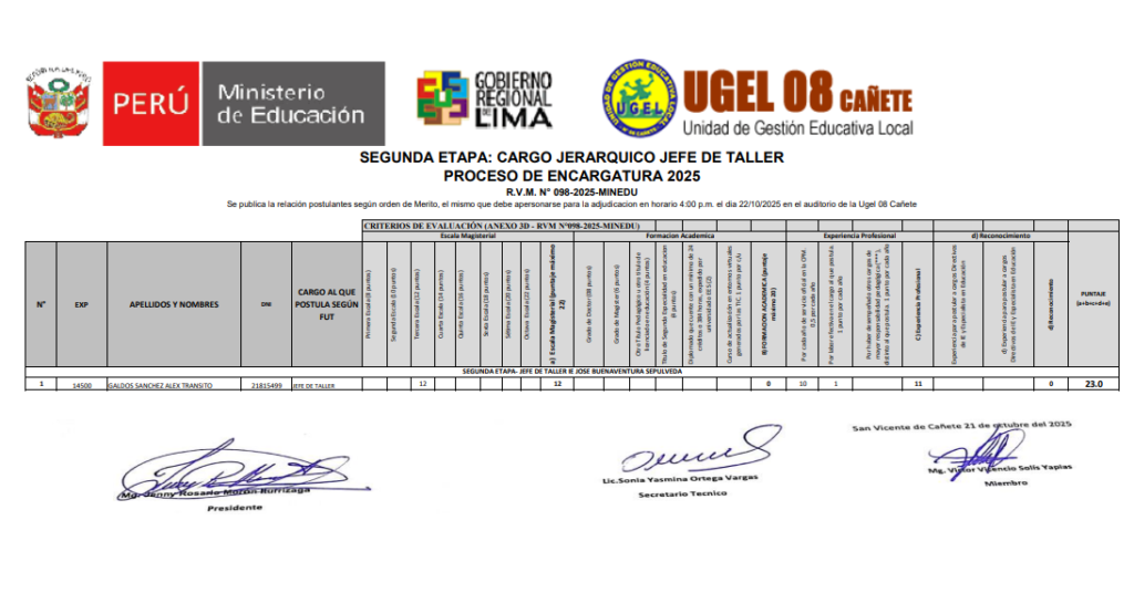 Mar, 21 de octubre del 2025, 5:28 PM por UGEL 08 CAÑETELa UGEL 08 Cañete publica la relación de postulantes según orden de mérito correspondiente a la Segunda Etapa: Cargo Jerárquico Jefe de Taller, en el marco de la R.V.M. N.° 098-2025-MINEDU.