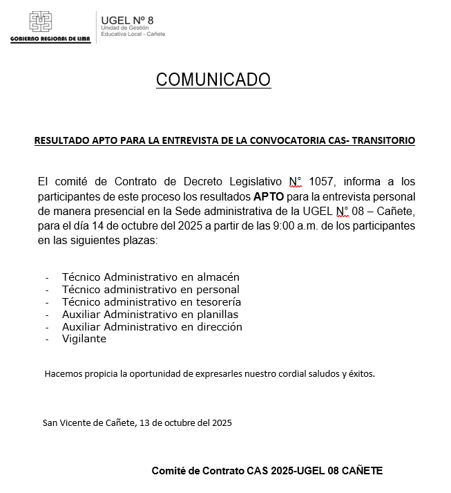 Lun, 13 de octubre del 2025, 8:30 PM por UGEL 08 CAÑETELa UGEL N° 08 – Cañete informa a los participantes del proceso de Convocatoria CAS – Transitorio bajo el D. Leg. N° 1057, los resultados APTO para la entrevista personal que se llevará a cabo el día Martes 14 de octubre de 2025, a partir de las 9:00 a.m. en la sede administrativa de la UGEL 08 – Cañete.