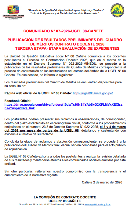 📢 COMUNICADO UGEL N.° 08 CAÑETE Publicación de Resultados Preliminares – Cuadro de Méritos Contrato Docente 2026Tercera Etapa – Evaluación de Expedientes