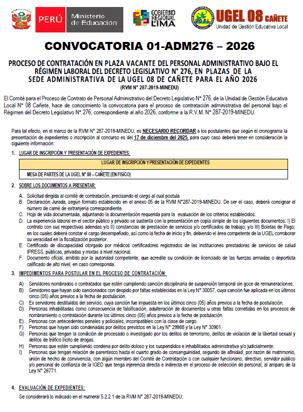 Lun, 1 de diciembre del 2025, 6:17 PM por UGEL 08 CAÑETELa UGEL 08 Cañete comunica a los postulantes la realización del Proceso de Contratación en Plaza Vacante de Personal Administrativo bajo el D. Leg. N.° 276, para plazas de la Sede Administrativa – Año 2026, conforme a la RVM N.° 287-2019-MINEDU.