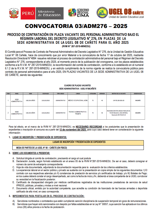 La UGEL N.º 08 Cañete comunica el Proceso de Contratación en Plaza Vacante del Personal Administrativo bajo el Régimen Laboral del Decreto Legislativo N.º 276, en plazas de la sede administrativa para el año 2025, conforme a la R.V.M. N.º 287-2019-MINEDU.