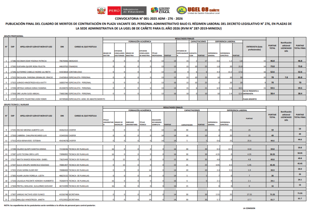 Mar, 23 de diciembre del 2025, 10:45 PM por UGEL 08 CAÑETELa Comisión de Contratación de la UGEL N.° 08 Cañete hace de conocimiento público el Cuadro de Méritos Final correspondiente a la Convocatoria N° 001-2025 ADM – 276 – 2026.