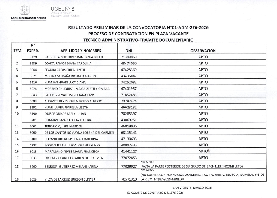 La UGEL N.° 08 Cañete informa a los postulantes y público en general los resultados preliminares de la Convocatoria N.° 01-ADM-276-2026, correspondiente al Proceso de Contratación en Plaza Vacante – Técnico Administrativo (Trámite Documentario).