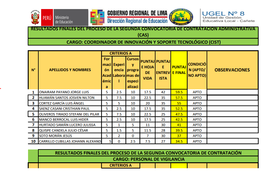 Jue, 16 de abril del 2026, 10:38 AM por UGEL 08 CAÑETELa UGEL N.° 08 Cañete informa a la ciudadanía los resultados finales del proceso de contratación administrativa de servicios (CAS) para los siguientes cargos: