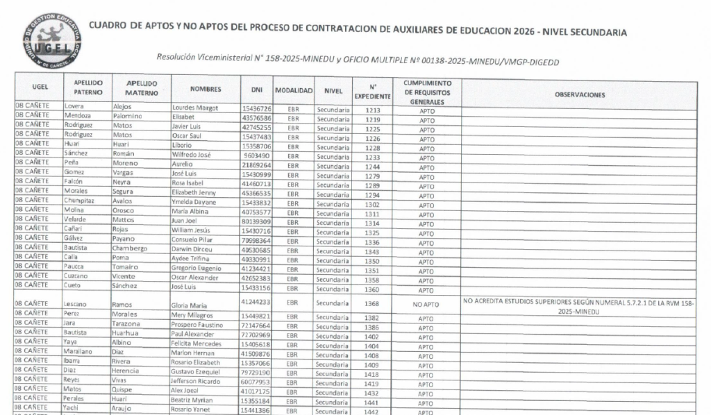 🔍 Atención Postulantes: Revisar la columna de «Observaciones» en caso de figurar como «No Apto», según lo estipulado en la R.V.M. N° 158-2025-MINEDU.