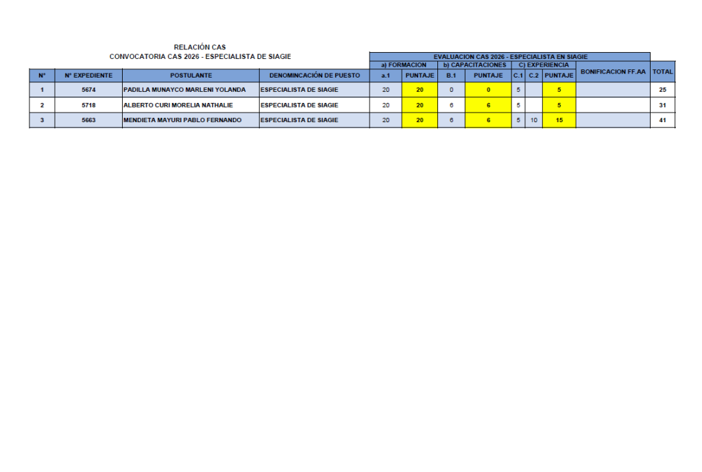 📢 RESULTADOS PRELIMINARES- Convocatoria CAS 2026 – Especialista de SIAGIE