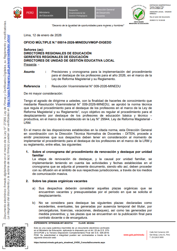 La Unidad de Gestión Educativa Local N° 08 Cañete hace de conocimiento a los directores y docentes de nuestra jurisdicción que el Ministerio de Educación ha emitido el Oficio Múltiple N° 00014-2026-MINEDU/VMGP-DIGEDD.