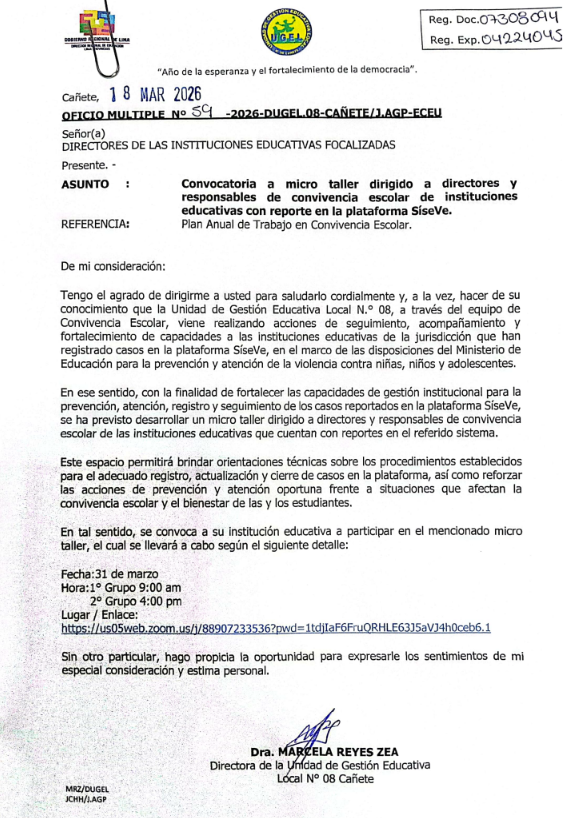 Jue, 19 de marzo del 2026, 7:25 PM por UGEL 08 CAÑETE💡 Fortalece tus capacidades y mejora la gestión de casos en la plataforma SíseVe.