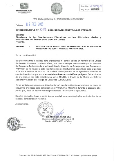 🚨 🚨Atención directores (as), de las Instituciones Educativas Públicas de la UGEL 08 Cañete, se comparte Oficio Múltiple 0189 – 2026-UGEL.08-CAÑETE/J.AGP-PREVAED.