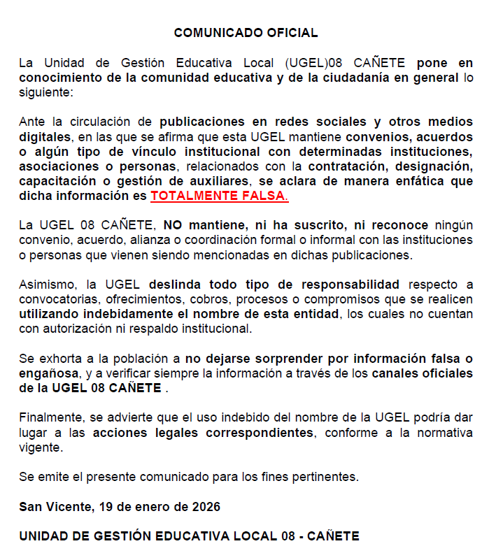 Lun, 19 de enero del 2026, 10:57 AM por UGEL 08 CAÑETEAnte la circulación de información errónea en redes sociales, la UGEL 08 CAÑETE aclara enfáticamente lo siguiente: