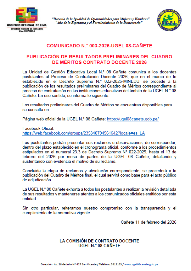 Mié, 11 de febrero del 2026, 9:50 PM por UGEL 08 CAÑETELa UGEL N° 08 Cañete hace de conocimiento a los docentes postulantes al Proceso de Contratación Docente 2026 que, en cumplimiento del Decreto Supremo N.° 022-2025-MINEDU, ya se encuentran disponibles los RESULTADOS PRELIMINARES del Cuadro de Méritos.