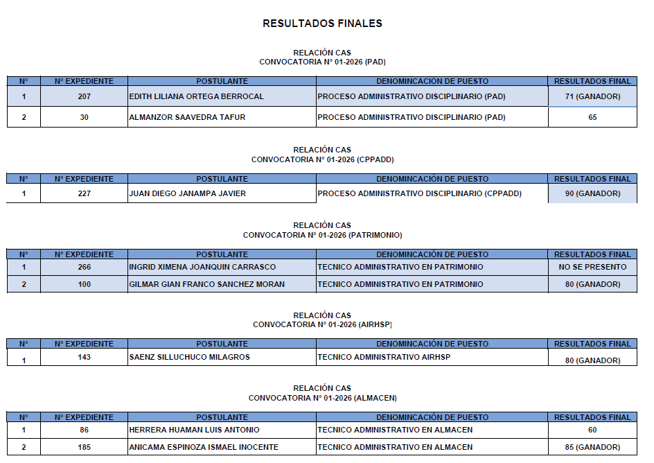 Vie, 9 de enero del 2026, 12:36 PM por UGEL 08 CAÑETESe hace de conocimiento público los RESULTADOS FINALES de la CONVOCATORIA CAS N° 01-2026