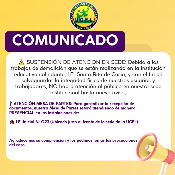 ⚠️ SUSPENSIÓN DE ATENCIÓN EN SEDE: Debido a los trabajos de demolición que se están realizando en la institución educativa colindante, I.E. Santa Rita de Casia, y con el fin de salvaguardar la integridad física de nuestros usuarios y trabajadores, NO habrá atención al público en nuestra sede institucional hasta nuevo aviso.