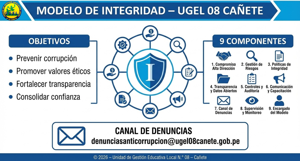 Mié, 21 de enero del 2026, 1:42 PM por UGEL 08 CAÑETELa Unidad de Gestión Educativa Local N.° 08 – Cañete reafirma su compromiso con una gestión pública íntegra, transparente y orientada al servicio de la ciudadanía. Implementamos el Modelo de Integridad como herramienta fundamental para prevenir actos de corrupción y fortalecer la ética en el ejercicio de la función pública.
