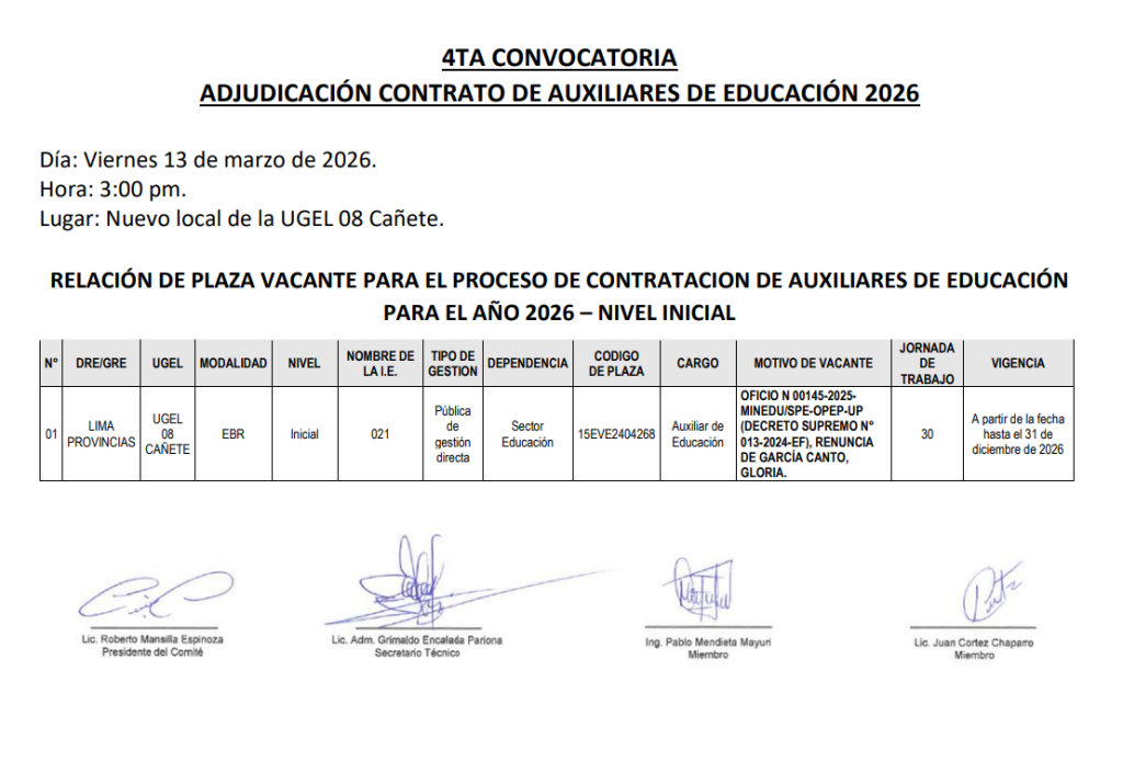 4TA CONVOCATORIA ADJUDICACIÓN CONTRATO DE AUXILIARES DE EDUCACIÓN 2026 Jue, 12 de marzo del 2026, 3:16 PM por UGEL 08 CAÑETE En Noticias