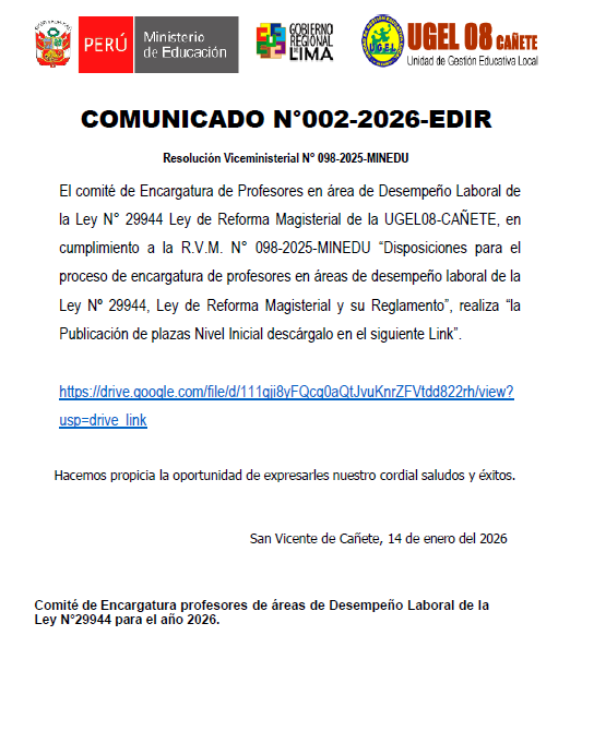 Mié, 14 de enero del 2026, 10:42 AM por UGEL 08 CAÑETEDescargar Comunicado: https://drive.google.com/file/d/17zmZBmX0_SwnrbSMc9WiJv2kOofMOE45/view?usp=sharing