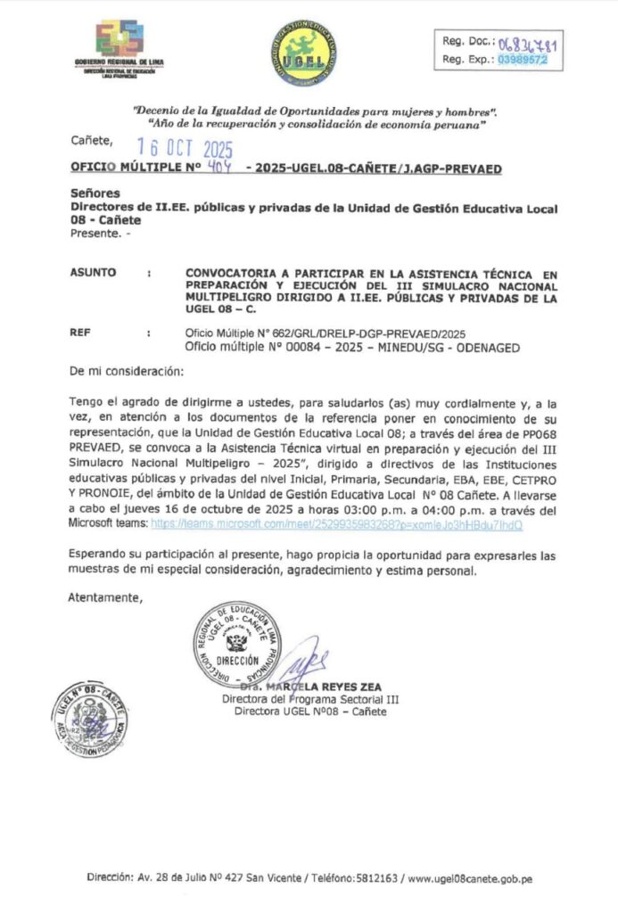 Jue, 16 de octubre del 2025, 12:47 PM por UGEL 08 CAÑETEConvocatoria a la Asistencia Técnica Virtual «PREPARACIÓN Y EJECUCIÓN DEL III SIMULACRO NACIONAL MULTIPELIGRO» dirigido a los directores(as) de IIEE públicas y privadas del ámbito de la UGEL 08 Cañete, la Asistencia Técnica Virtual se llevará a cabo el día jueves 16 de octubre a las 3:00 pm. Ingresando en el siguiente enlace Microsoft teams: https://teams.microsoft.com/meet/2529935983268?p=xomleJo3hHBdu7IhdQ