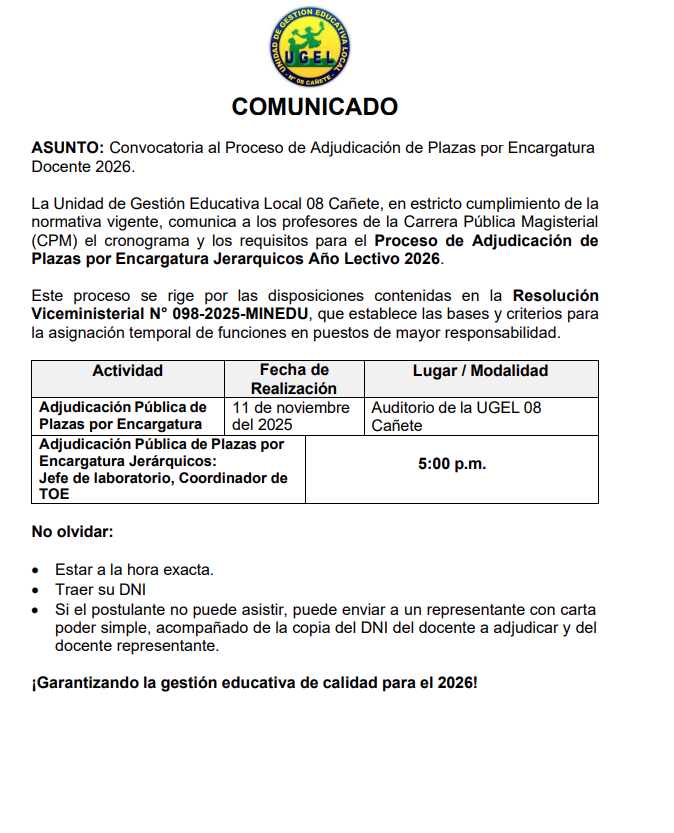 COMUNICADO Lun, 10 de noviembre del 2025, 5:07 PM por UGEL 08 CAÑETE CONVOCATORIA AL PROCESO DE ADJUDICACIÓN DE PLAZAS POR ENCARGATURA DOCENTE 2026 En Noticias