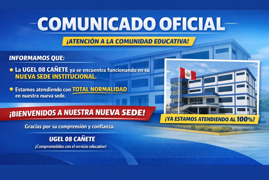 Vie, 20 de febrero del 2026, 8:02 AM por UGEL 08 CAÑETELa Unidad de Gestión Educativa Local N.° 08 de Cañete informa a los directivos, docentes, personal administrativo, padres de familia y público en general lo siguiente: