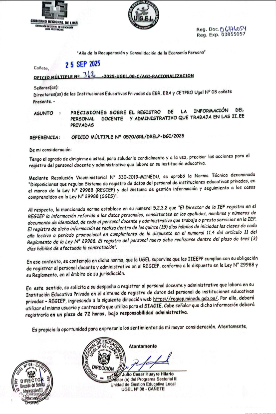 Cumplir con las precisiones sobre el registro de la informacion del personal docente y administrativo que trabajan en las II.EE Privadas. Jue, 25 de septiembre del 2025, 2:59 PM por UGEL 08 CAÑETE En Noticias