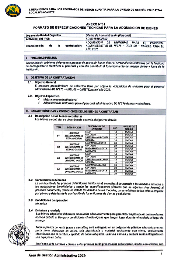 La presente es para manifestarle la necesidad de la Unidad de Gestión Educativa Local N°08 – Cañete de contratar la “Adquisición de uniforme para el personal administrativo DL N°276 – UGEL 08 – CAÑETE, para el año 2026”.