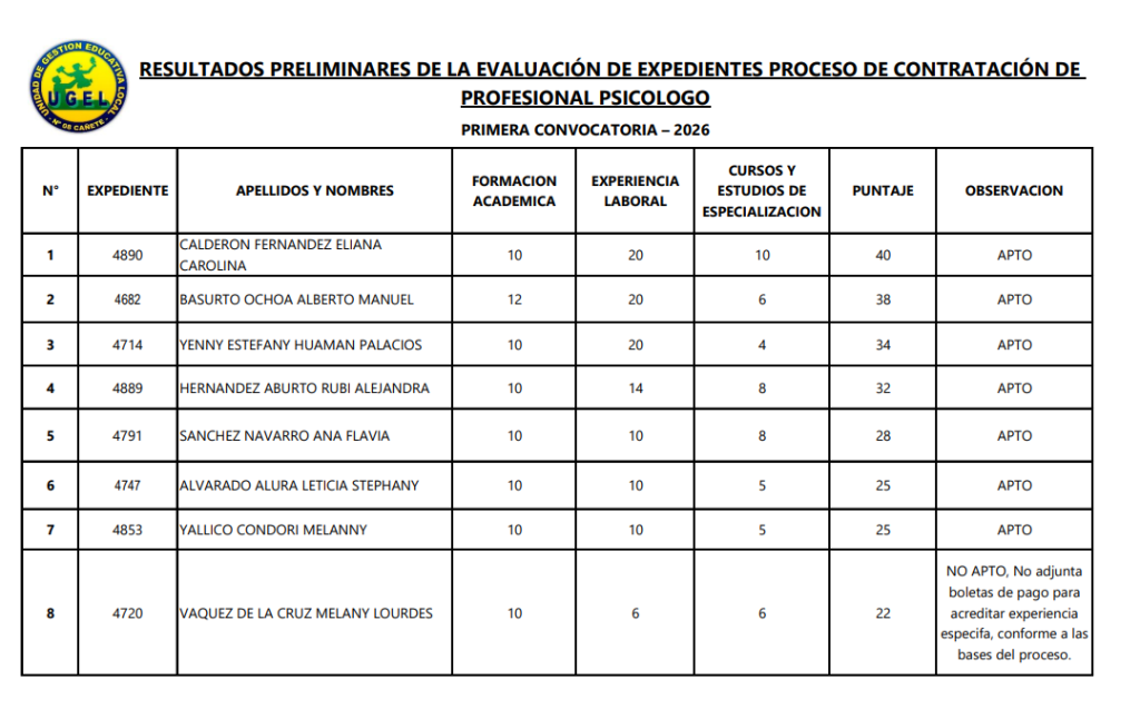 Mié, 4 de marzo del 2026, 9:39 AM por UGEL 08 CAÑETERESULTADOS PRELIMINARES – PROCESO DE CONTRATACIÓN 2026 SOPORTE EMOCIONAL -EICE I – II