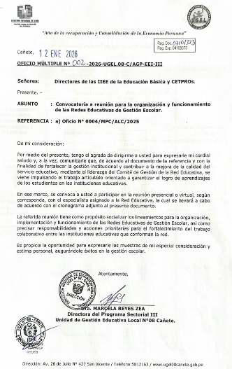 Lun, 12 de enero del 2026, 12:17 PM por UGEL 08 CAÑETEAsunto: Convocatoria a reunión por la organización y funcionamiento de las Redes Educativas de Gestión Escolar