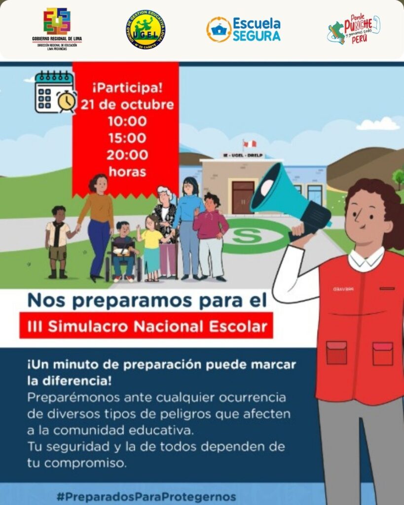 📌 Si bien a nivel nacional la fecha establecida es el 13 de octubre, esta coincide con la Semana de Gestión Escolar. Por tal motivo, en el ámbito del sector educación de nuestra región Lima, el #simulacro se #desarrollará el #martes #21 de #octubre en los #siguientes #horarios: