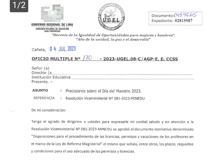 Precisiones sobre el Día del Maestro 2023 Referencia Resolución Viceministerial N° 0081-2023 MINEDU
