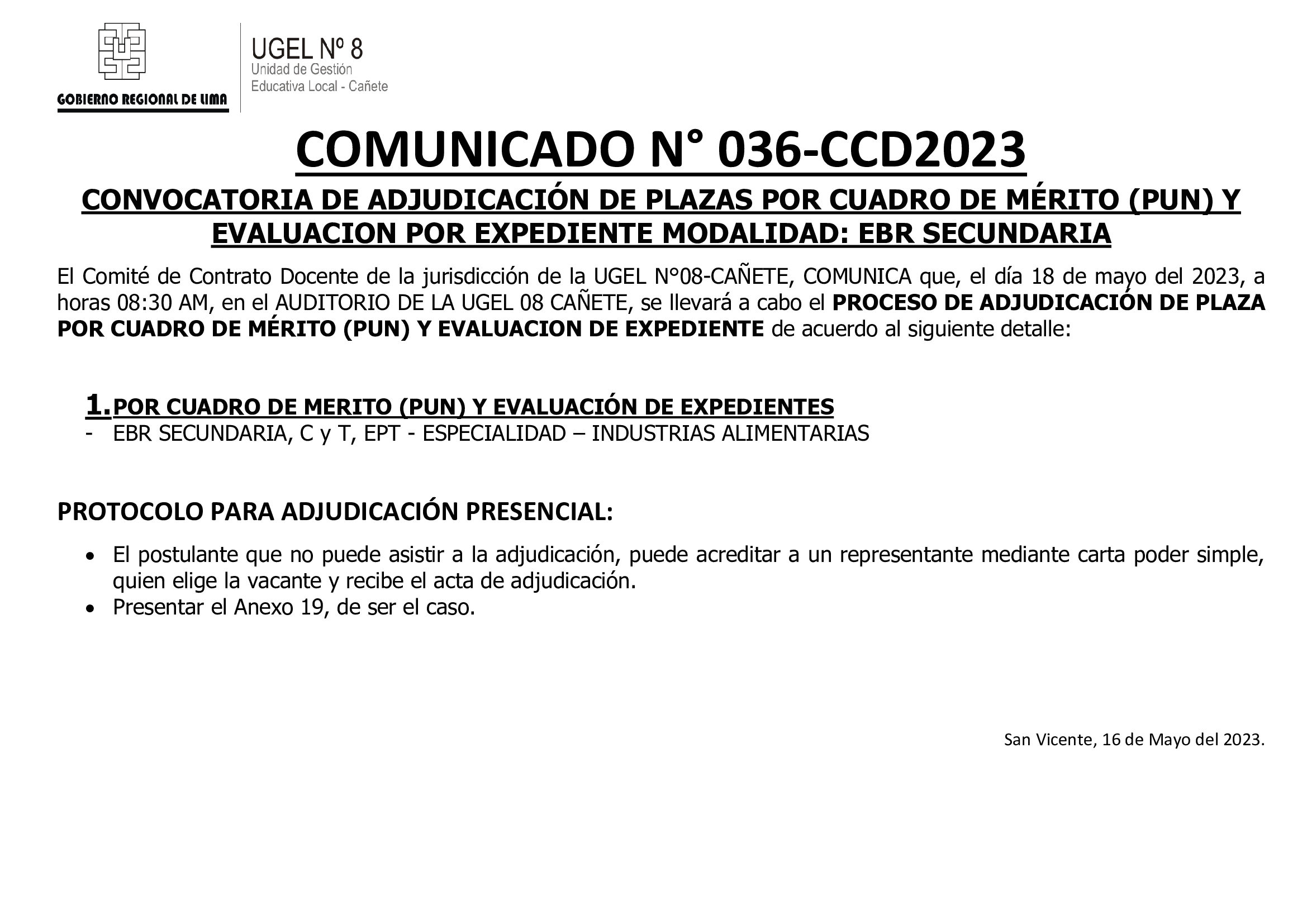COMUNICADO N° 036-CCD2023CONVOCATORIA DE ADJUDICACIÓN DE PLAZAS POR CUADRO DE MÉRITO (PUN) Y EVALUACION POR EXPEDIENTE MODALIDAD: EBR SECUNDARIA