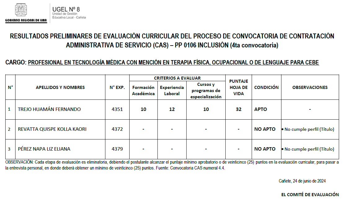 Leer mas...📌 El Comité de evaluación de plazas CAS – PP 0106 Inclusión de niños, niñas y jóvenes con discapacidad en la educación básica y técnico productiva, en cumplimiento a lo establecido por la R.M. N° 009-2024-MINEDU , su modificatoria RM N° 060-2024-MINEDU, y la 4ta convocatoria, hace de conocimiento los 📋 Resultados preliminares de evaluación […]