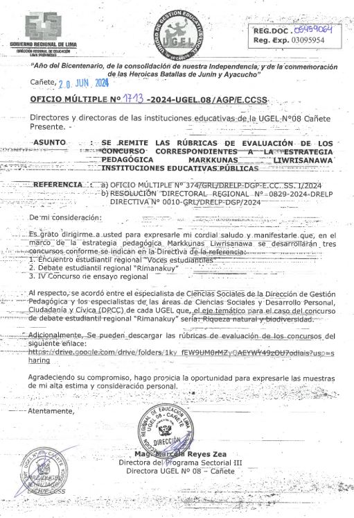 Leer mas...CONVOCATORIA PARA LA CONTRATACIÓN ADMINISTRATIVA DE SERVICIOS PARA LA UNIDAD DE GESTIÓN EDUCATIVA LOCAL Nº 08 – CAÑETE Descargar Convocatoria: https://drive.google.com/file/d/1uZfwmFZsxpUj5n17b2e0W4uLQk3eQDgy/view?usp=sharing