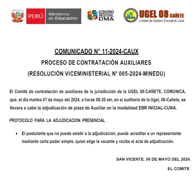 Mar, 7 de mayo, 2024 San Vicente Cañete.Se convoca a las Directivos de las II.EE Polidocente de educación inicial a la Reunión Informativa Descargar Oficio: https://drive.google.com/file/d/1HtjDKKA1ZPXmAgWikpKe8qierLL3iOSL/view?usp=sharing