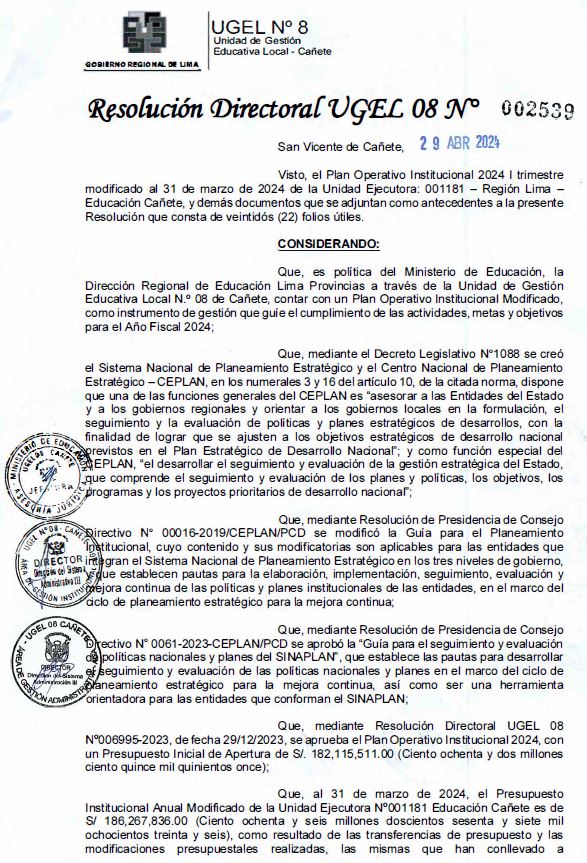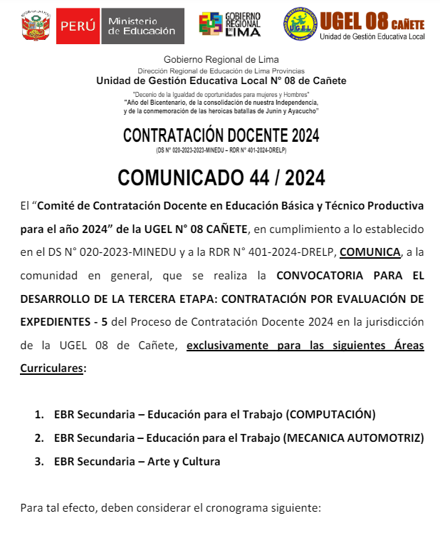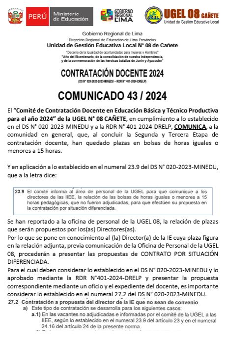 OFICIO MULTIPLE N° 117-2024-DUGEL.08-CAÑETE./AGA/PERS.