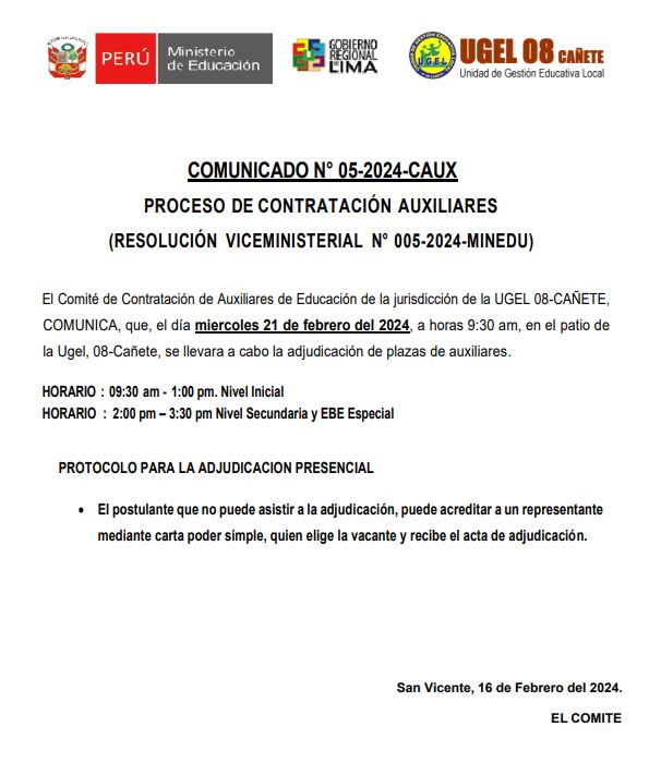 Lun, 26 de febrero, 2024 San Vicente Cañete.PROCESO DE CONTRATACIÓN AUXILIARES Descargar Comunicado: https://drive.google.com/file/d/15mtly_nPQByCJojh85tEKGwIxpXppyNM/view?usp=sharing